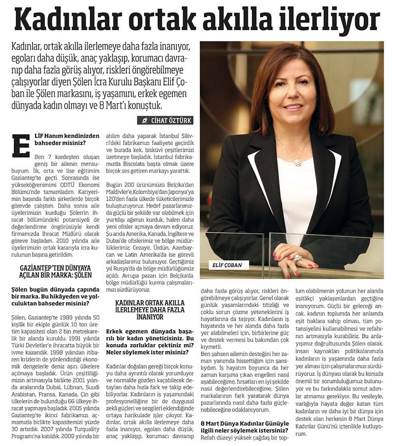 Kadınlar, ortak akılla ilerlemeye daha fazla inanıyor, egoları daha düşük, anaç yaklaşıp, korumacı davranıp daha fazla görüş alıyor, riskleri öngörebilmeye çalışıyorlar diyen Şölen İcra Kurulu Başkanı Elif Çoban ile Şölen markasını, iş yaşamını, erkek egemen dünyada kadın olmayı ve 8 Mart’ı konuştuk.