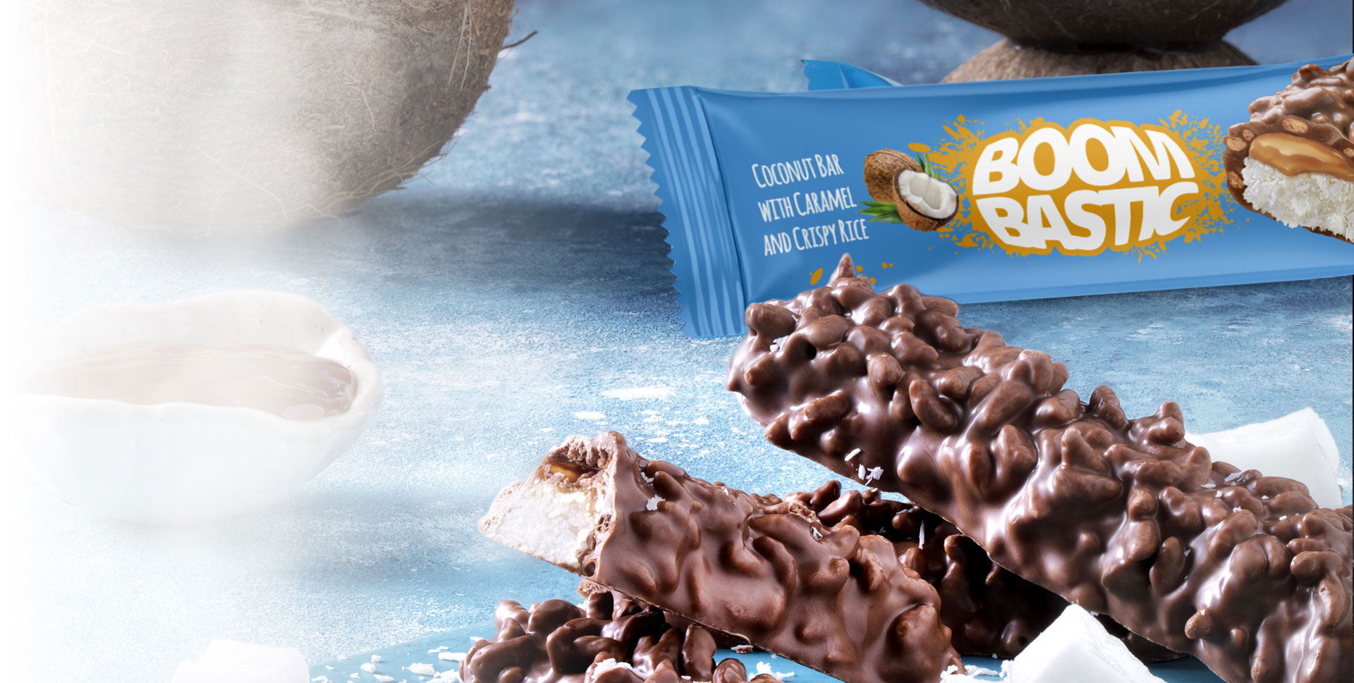 Exotic coconut bar with caramel, crispy rice and milk chocolate